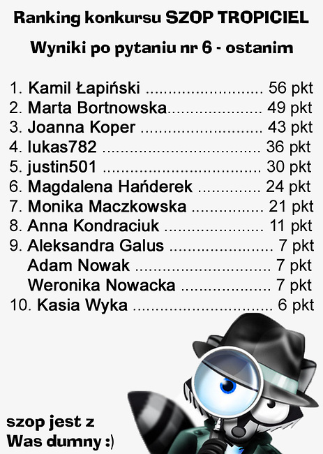 Bezpośrednio po każdym pytaniu na stronie www.outletszop.pl publikowany będzie ranking punktowy, dzięki czemu możecie cały czas trzymać rękę na pulsie. Imiona trzech zwycięzców z największą liczbą punktów zebranych w czasie trwania konkursu ogłosimy 20 lutego 2014 roku. Zatem Tropiciele – bądźcie czujni. Pełny regulamin konkursu znajduje się TUTAJ.